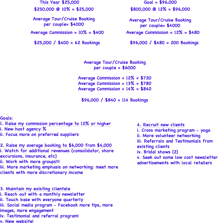 Visit your preliminary plan from many different angles. Look for additional revenue streams (insurance sales, consolidators, shore excursions), working more with groups and working with a more affluent clientele.